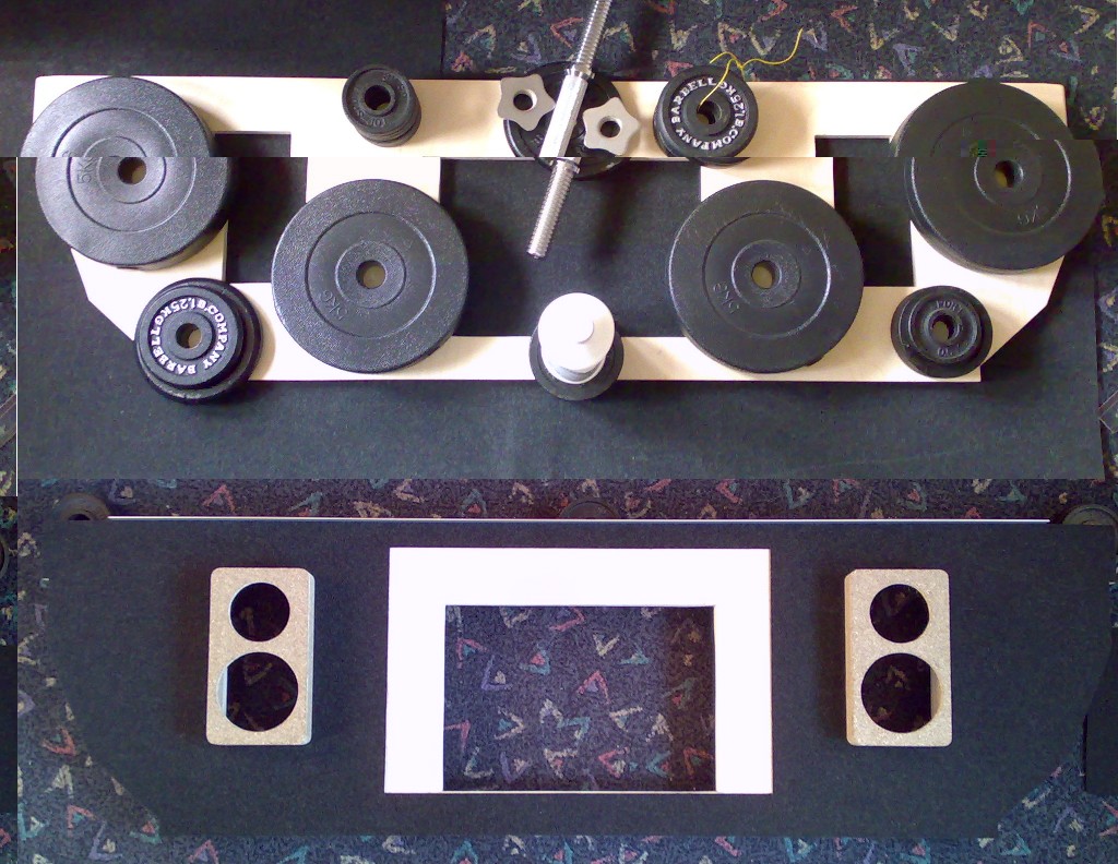 Dann KFZ-Teppich aufkleben und mit ein paar Hantelgewichten beschweren. Danach ausscheiden. Die beiden Lautsprecher-Halterungen hab ich auch schon mal mit rein gelegt, ob es denn auch passt: