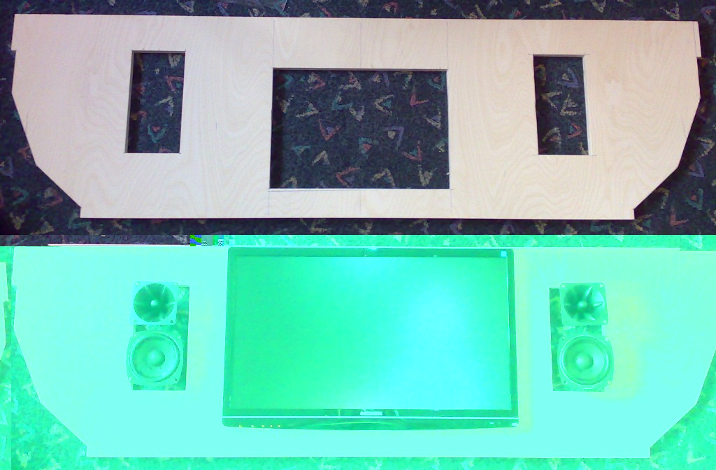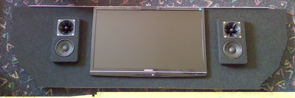 Hier ist nun alles mit Teppich beklebt, die Lautsprecher-Chassis eingeschraubt und der Monitor montiert. Oben und unten an der Kante noch zwei Alu-Winkel angeschraubt, damit das Ganze nicht krumm wird. Die Kabel sind mit Spiralschlauch zusammengeführt und gehen unten rechts weg:
