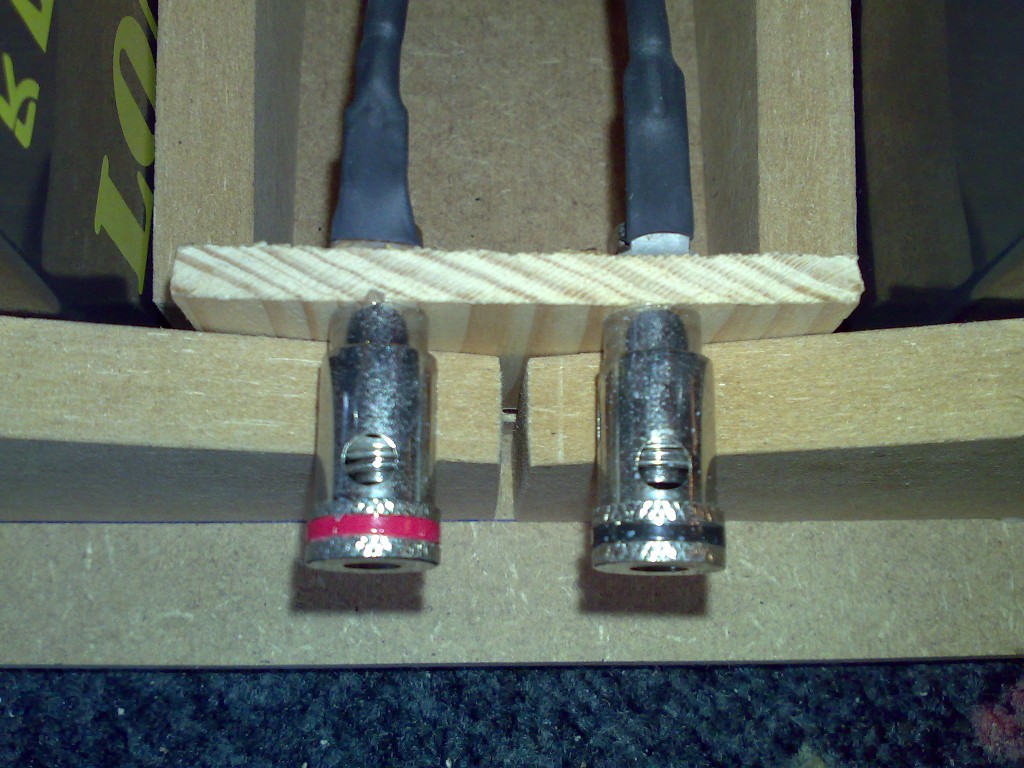 Hier das Anschlussterminal. Die Klemmen sind von einem alten Subwoofer geklaut worden und eignen sich hier ideal für sichere Verbindung und gleichzeitig schnelle Trennmöglichkeit.