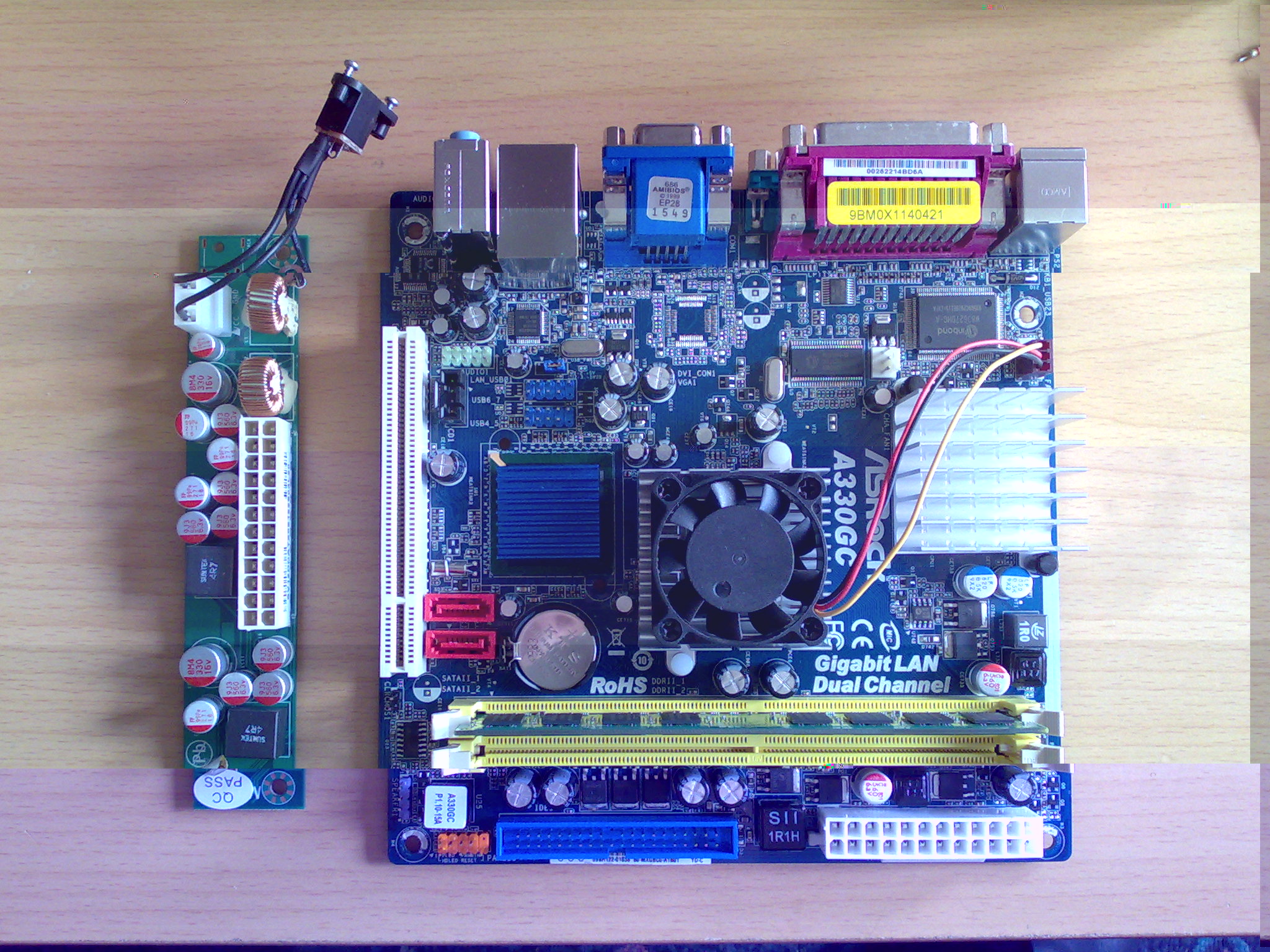 Das ganze wird gespeist von einem Step-Down Wandler. Der stellt die 3,3V, 5V, 5Vsb, -5V, -12V und natürlich +12V aus den eingespeisten 12V bereit. Der maximale Strom in der 12V-Zuleitung beträgt 2,6A, was eine Leistungsaufnahme von nur etwas über 30W für den Rechner bedeutet!