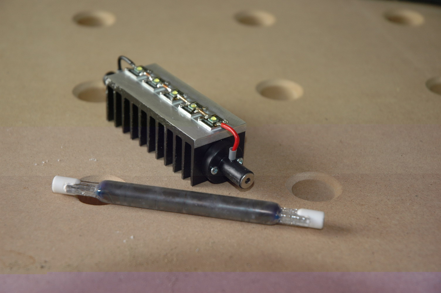 Inzwischen gibt es die Strahler mit LEDs auch schon fertig, allerdings nicht ganz preiswert. Es fängt bei 10W LEDs an und geht bis weit über 100W. Ich hatte bei mir im Blog schon mal Vergleichsfotos eingestellt. Man kann so in etwas sagen, dass man mit 10W LED (ca. 14W Aufnahme) 150W Halogen ersetzen kann. Mit 20W (auf jeden Fall mit 30W) ersetzt man dann 300W Halogen. Das ist dann schon eine gewaltige Stromeinsparung.