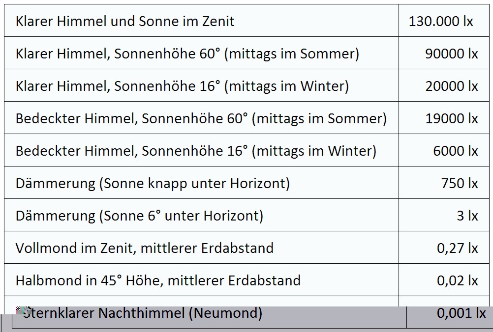 Wie man sieht, deckt die natürliche Beleuchtung den Bereich einiger Zehnerpotenzen ab. Im Verlaufe der Evolution haben sich Auge und Gehirn an diese Tatsache angepasst.