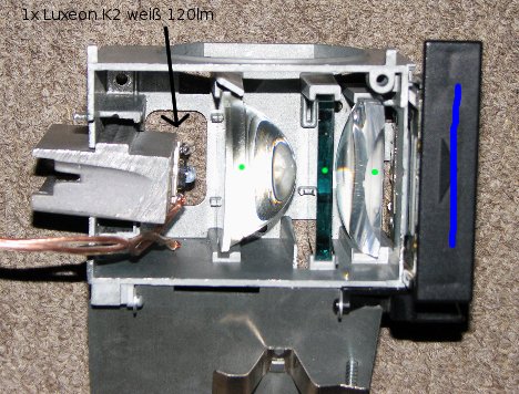 Hab einen alten Diaprojektor(ehemals 150Watt Glühbirne) auf eine Luxeon K2 weiß 120Lumen umgebaut.
