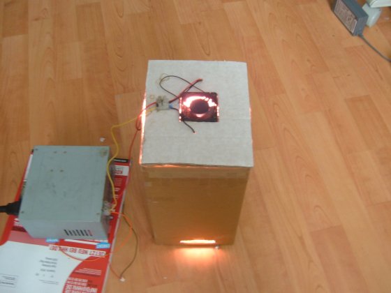 Oben die Lampe die die Warme Luft vom Kühlkörper ins Innere der Box blässt,so herrscht in der Box auch gleichzeitig eine für die Pflanze perfekte Temperatur und sie kreigt immer frische Luft.