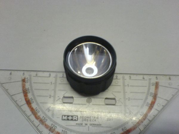 Lampenkopf mit Reflektor auf Geodreieck zum Größenvergleich :