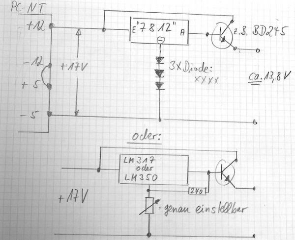 Kannst du dir nicht irgendwo einen günsitgen Trafo besorgen der die (ca.) 5A bei 12Volt bringt? Dann nur noch nen Brückengleichrichter (z.B. den B40C7000 mit Kühlkörper; danach ist die Spannung etwas höher), und zum genauen Einregeln der 13,8 Volt einen Spannungsregler. Z.B. den LT 1083 CP, bei C Art.-Nr. 148156 - 62. Die Beschaltung findest du bei C oder im I-Net. Ist wahrscheinlich einfacher als das NT umzumodden.