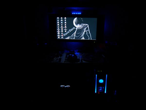OK fangen wir bei meiner Technik Ecke an! Das ganze im Dunkeln! Nein ist kein Philips sind nur 4 SMD Röhren! Mein kleiner Bildschirm. Naja und mein Sofa! Wie ihr seht steh ich auf Farbe! Das Poster ist übrigens selbst gemacht! (meine Leutz) Wie ihr seht klein aber oho!