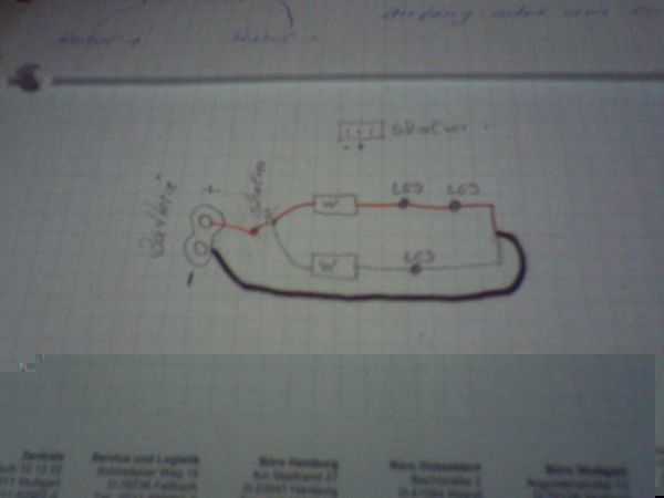 Im hinteren Bereich ein Loch für den An-Aus Schalter. Die Zeichnung wie was gelötet ist , ist leider nicht so professionell wie ihr es gewohnt seit.