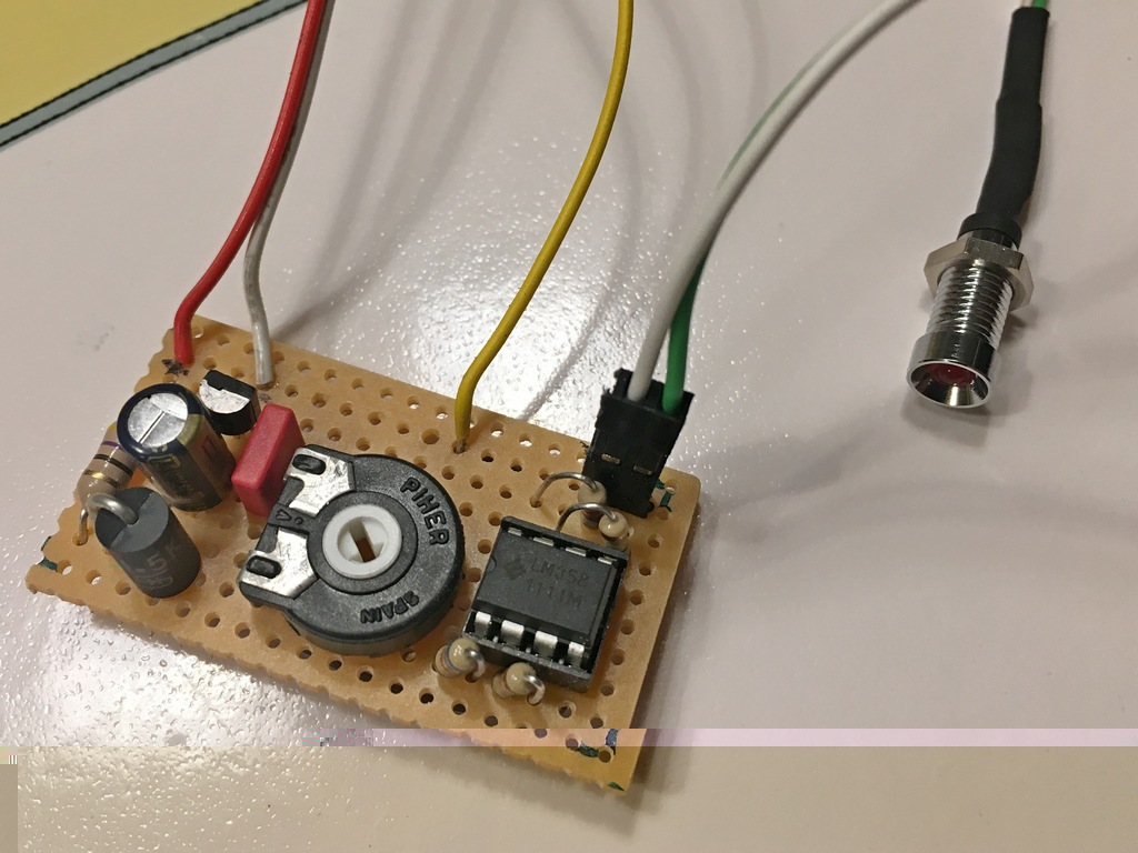 Nicht über die Bauteile wundern. In LTSpice (wo ich den Plan erstellt habe) gibt es keinen LM358 OP und auch keine 'rote Anzeige-LED'. Die sind aber ähnlich genug.