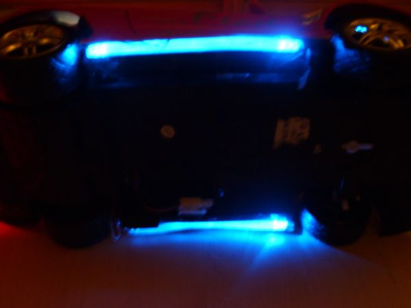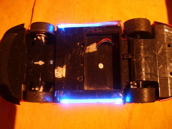 Insgesamt habe ich 2 weiße LEDs für vorne;2 rote für hinten;3 weiße für Lautsprecherbeleuchtung;4 blaue für Untergrundbeleuchtung, alle durch insgesamt 8 Batterien mit strom versorgt von hinten von unten, ich habe in ein durchsichtiges Plastikrohr jeweils vorn und hinte eine blaue led reingesteckt Lautsprecherbeleuchtung Stromversorgung, die sitze mussten leider ausgebaut werden