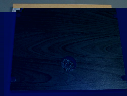 Die Regalplatte mit dem einzubauenden Modul und dem angezeichneten Loch.