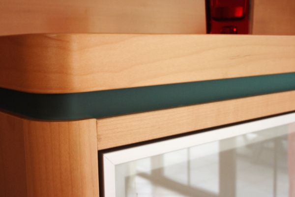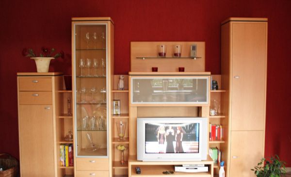 Hier nun nochmal die Schrankwand im ursprünglichen Zustand. Es ist bereits die Vorebreitung für eine Beleuchtung vorhanden. Der grüne sichtbare Streifen, der auf jedem Element zu sehen ist, ist grün satiniertes Glas. Dahinter befindet sich ein Hohlraum, der ca. 3cm hoch und so tief und breit ist, wie die einzelnen Elemente sind.