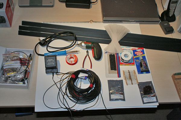 Abisolierzange, Isolierband, 3m Kunststoffkanten (25 x 25mm) dienen zur Fixierung der LED's, ca. 25m 1,5mm Kabel, 1 regelbares Netzteil von 3-12V, Lüsterklemmen, Tesa Powerstrips, Sekundenalleskleber, beidseitig klebendes Klettband, 50 weiße 11.000mcd LED's, diverses Werkzeug und natürlich der gute alte Feinlötkolben inkl. Lötzinn.