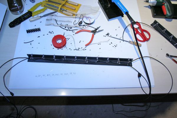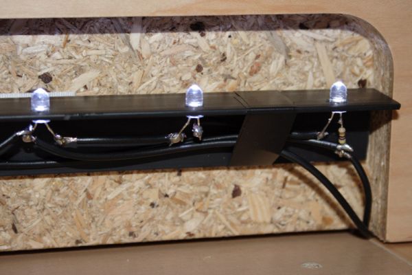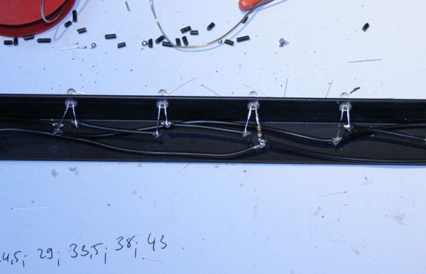 Nun folgen diverse Arbeiten, wie Löcher in die Kunststoffkanten bohren, damit die 5mm LED's in die Kanten fixiert werden können. Vorher werden die Kanten natürlich auf die entsprechende Länge gesägt. Sobald alle LED'S an ihrem Platz sitzen werden diese miteinander verlötet. Jeweils 3 LED's in Reihe und entsprechend 16 Paralellschaltungen. Macht unterm Strich nur 48 LED's. Die letzten beiden LED's bilden eine 2er Reihenschaltung und somit die 17te Parallelschaltung. Von der Leistung her gitb es nur den Unterschied, dass die 2 LED's bereits bei einer Spannung von weniger als 7,5V leuchten, die 3er Reihenschaltungen leuchten erst bei einer Spannung ab 7,5V. Bei Vollast (12V) gibt es keine Helligkeitsunterschiede.