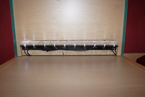 Natürlich wird zwischendurch, soweit möglich, schon mal getestet. Ich konnte schon die erste Reihenschaltung kaum abwarten und so habe ich nach der ersten Reihenschaltung (3 LED's) schon mal unter realen Bedingungen bei 12V die Beleuchtung getestet:
