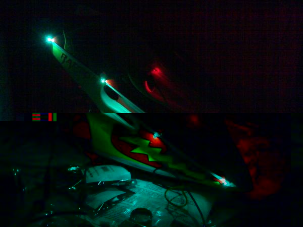Hi Kosta, Ich hatte schonmal einen Flieger mit Farbigen LED`s bestückt und damit nicht so den Erfolg gehabt weil sie ab einer gewissen Entfernung kaum noch zu sehen sind. Deswegen bin Ich auf UV gekommen. Ich weiß auch nicht wie weit Ich vom Rumpf weg muß um das Licht bestmöglich aus zu beuten. Es i...