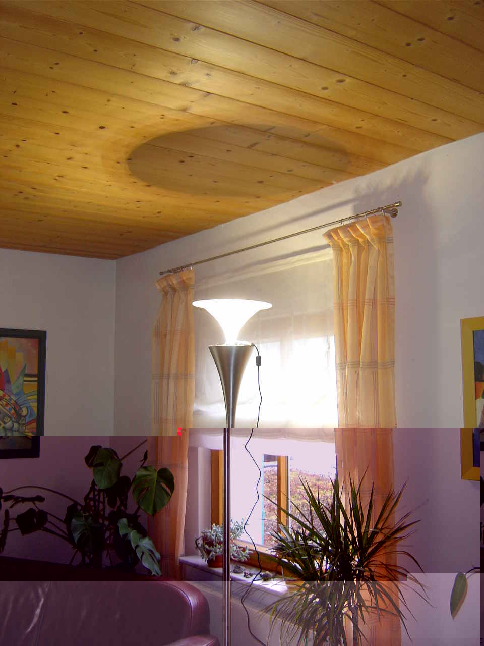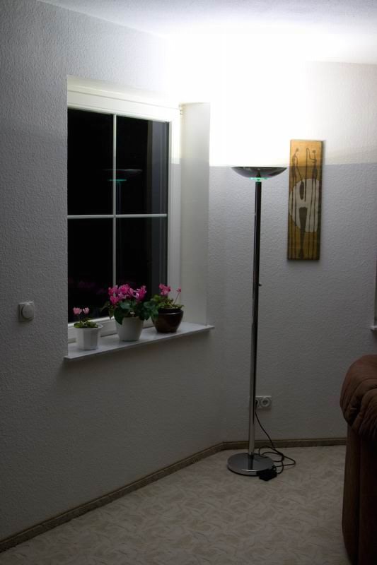 Die Fotos hatte ich wohl vergessen ... Ich habe deshalb 3 Fotos angehangen, welche bei ca. 30%, 60% und 100% Helligkeit gemacht wurden. Alle Fotos sind gleich belichtet (1/10s f4.0 ISO400). Wie üblich sind die Lichtkegel nicht so stark wie auf dem Foto zu sehen. Die niedrigste Einstellung ist meist zum Fernsehen an, die zweite Variante reicht zum Lesen locker aus. Die Position der Lampe ist bzgl. der Abstrahlung/Reflexion sicher auch nicht optimal. Aber ich denke, man kann es so schon gut beurteilen.