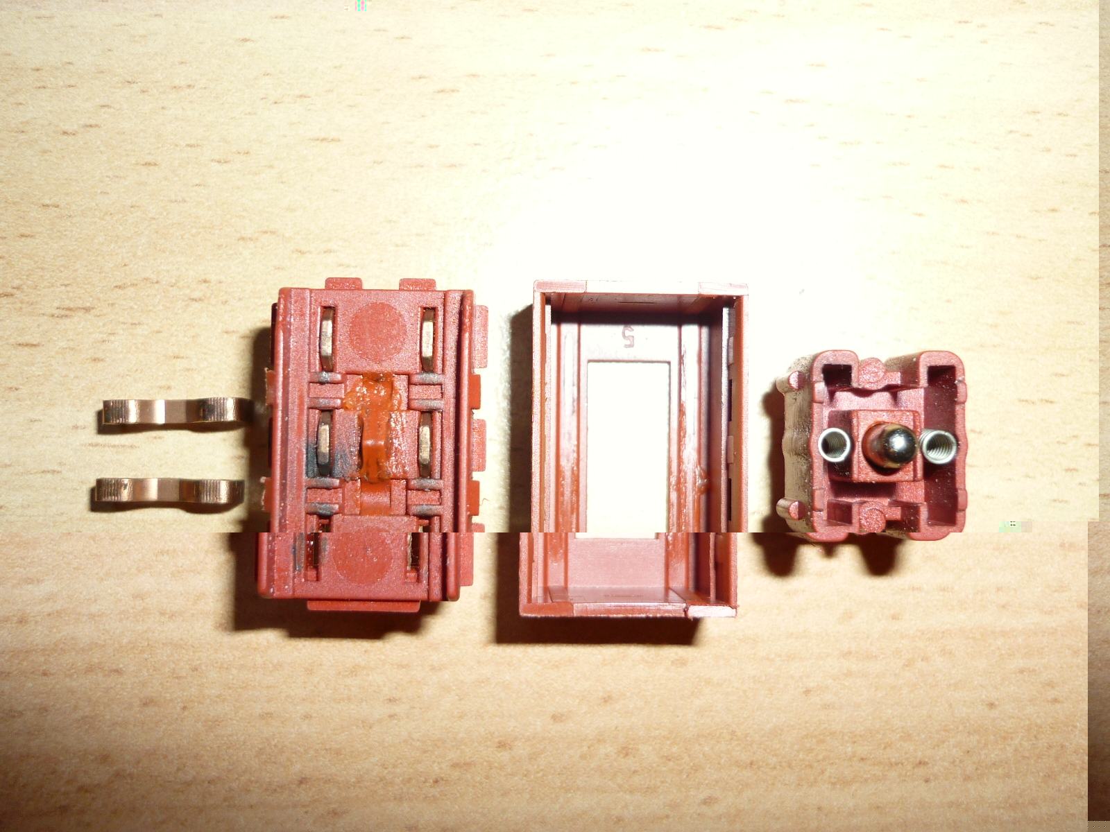 Wenn Du an den vier eingelassenen Kontaktstiften herum schleift, dann funktioniert das Teil auch mit neuen Kontaktplatten nicht mehr. Das ist schon alles sehr genau abgestimmt. Nach dem Reinigen solltest Du nur die Aufnahme für den Schaltschieber, das Ding in der Mitte wieder dünn einfetten. Unbedingt Silikonfett nehmen, sonst schiebt sich der Schalter nicht mehr gut. Das ist auch der Grund, warum Du nicht schleifen sollst, die Mechanik muss zwei gegenläufige Anforderungen erfüllen, guten Kontakt liefern aber auch leichtgängig sein, da reichen wenige Zehntel und es rutscht zwar gut, aber der Kontakt steht nicht mehr fest und neue Schäden an den Kontaktplatten sind vorprogrammiert.