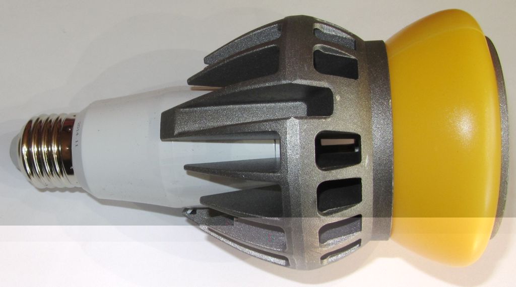 Auffällig ist der Ring aus scheinbar gelbem Kunststoff, der schlussendlich als Leuchtelement dient. Hierbei handelt es sich offensichtlich um klaren Kunststoff, der auf der Innenseite mit einer Phosphorschicht beschichtet ist. Innerhalb dieses Rings befinden sich anscheinend blaue Leuchtdioden, die die Phosphorschicht (eigentlich das falsche Wort, besser wäre phosphoreszierende Schicht oder Leuchtschicht) zum Leuchten anregt. Ein ähnliches Prinzip hatte Philips vor einiger Zeit bereits verwendet. (Man möge mir nachsehen, dass ich dieses Leuchtmittel nicht zerlege; knapp 45€ sind mir dazu dann doch etwas zuviel.)