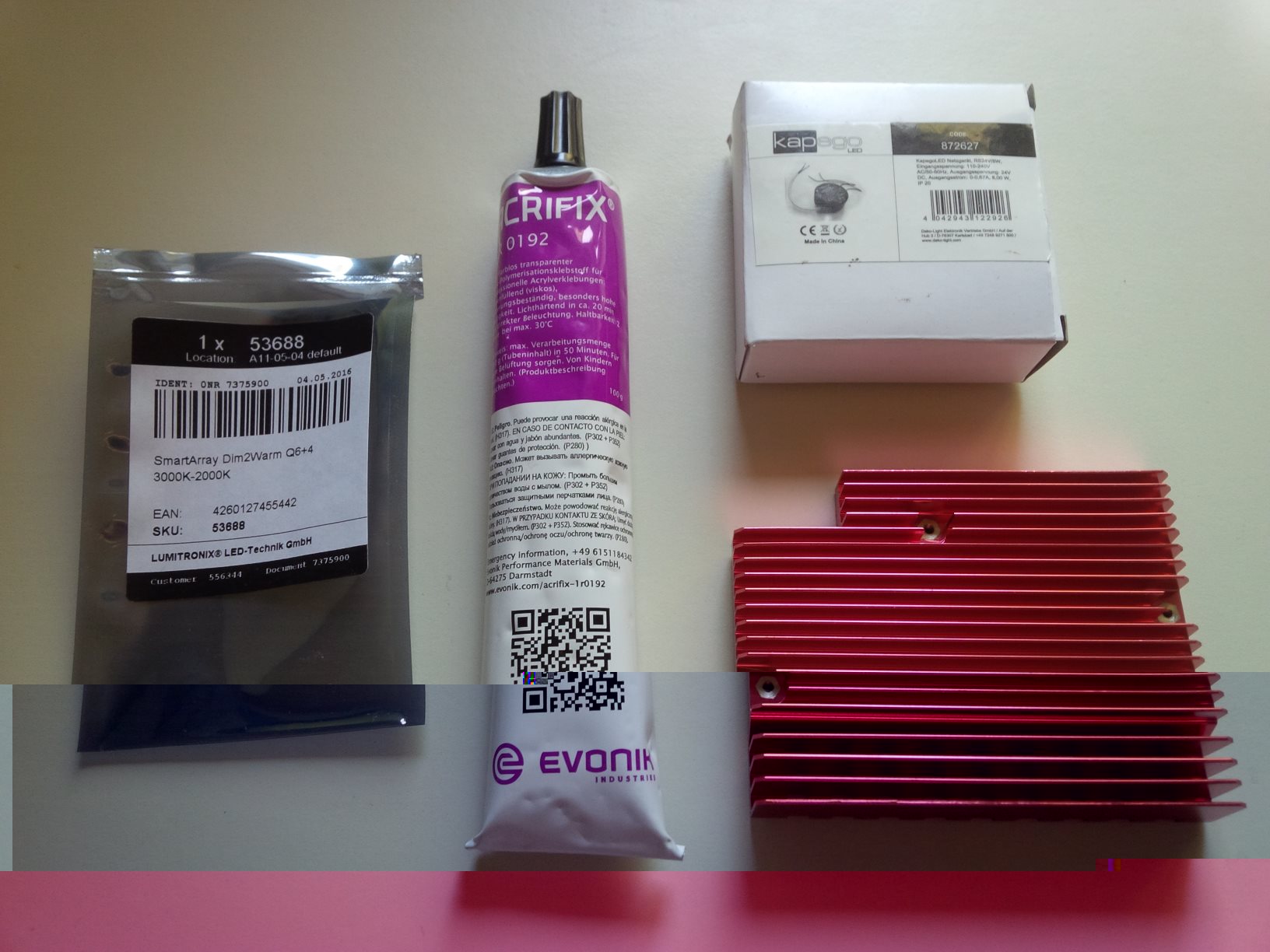 Insgesamt musste ich bei vier verschiedenen Händlern bestellen und zwei weitere Quellen für gratis Plexiglas und Kühlkörper anzapfen. Gekostet hat der Spaß inklusive Versandkosten: Netzteil Amazon 14,75 + SmartArray leds.de 14,80 + alles von Pollin 23,10 + Laserzeit 7,00 = 59,65 Euro. Plus 8,50 incl. Versand für den Acrylkleber, den ich aber sicher noch für andere Arbeiten verwenden werde.
