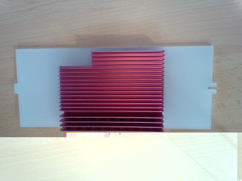 Mit einem Netzkabel und einem Ein-/Ausschalter dazu ist die Elektrik dann komplett. Einen Kühlkörper, der mehr als ausreichend sein sollte, entwende ich kostenlos von einer defekten, passiv gekühlten Grafikkarte (nVidia GeForce 7300 GS). Das komplette Leuchtengehäuse soll aus ca. 10 cm breiten Plexiglas-Restestreifen entstehen, die ich ebenfalls kostenlos aus der Mülltone eines Plexiglas verarbeitenden Betriebs fischen durfte. Dazu war noch die Bestellung von Acrifix 1R 0192 Spezialkleber notwendig.