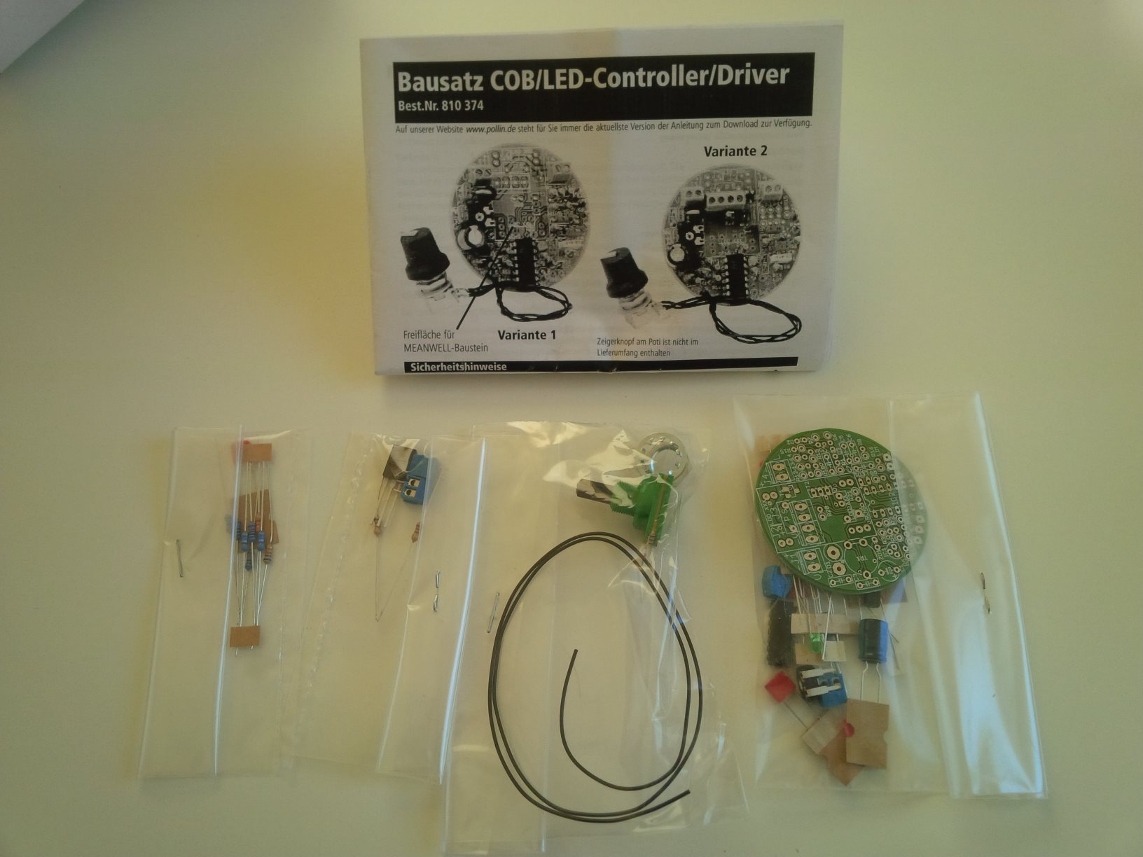 Der Bausatz für die dimmbare Konstantstromquelle vor und nach dem Bestücken: