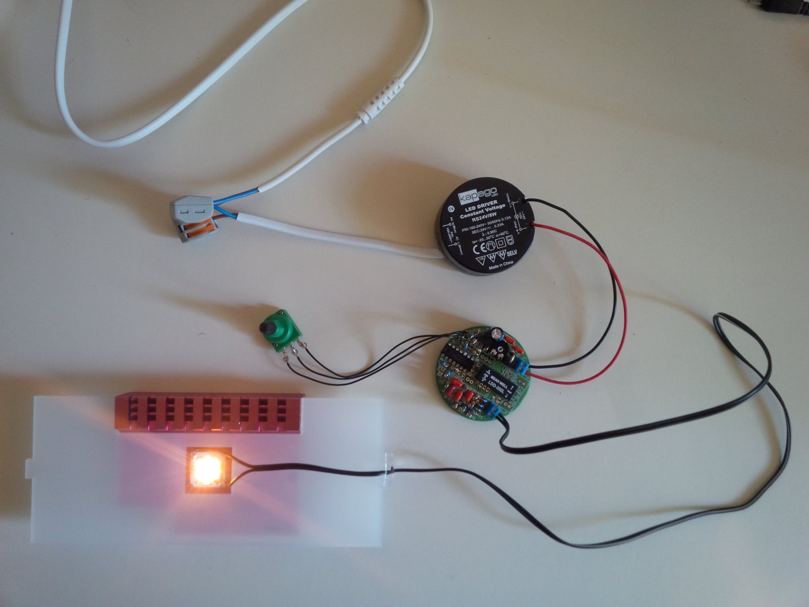 Bezüglich des Dimmens bin ich erst mal ziemlich ins Grübeln gekommen: so wie das SmartArray Dim2Warm aufgebaut ist, gehe ich davon aus, dass beim Dimmen per PWM nur die Helligkeit abnimmt, aber keine wesentliche Änderung der Farbtemperatur eintritt. Man muss also zwingend über die Stromstärke dimmen. Und da wird's schwierig, wil bei dimmbaren Konstantstromquellen eben häufig (wenn nicht meistens) PWM verwendet wird. Schlimmer noch, wird in Artikelbeschreibungen und Datenblättern häufig gar keine Angabe zum Dimmverfahren gemacht. Zumindest bin ich auf die LDD-350LW gestoßen, bei der explizit aus dem Datenblatt hervorgeht, dass sie per Stromstärke dimmt. Leider ganz kurios und blöde: das Einstellen der Dimmung muss hier trotzdem zwingend per externem PWM-Signal erfolgen. Einfach nur ein Poti geht nicht.