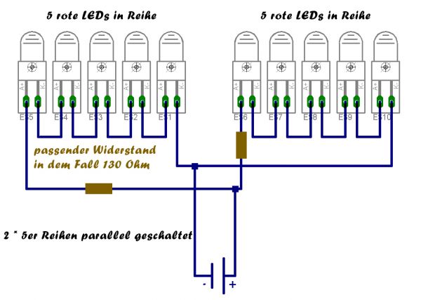 Da ich ein 12 V Schaltnetzteil habe ist es am sinnvollsten, die roten LEDs in 5er reihen zu schalten und die blauen in 3er Reihen