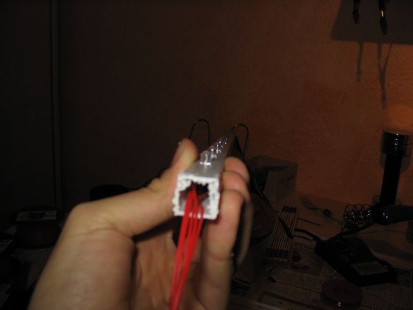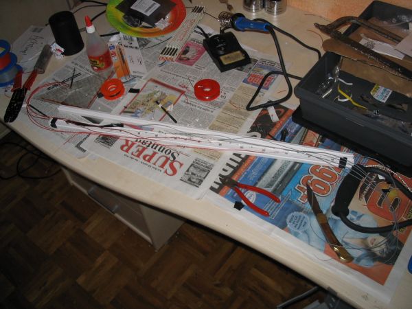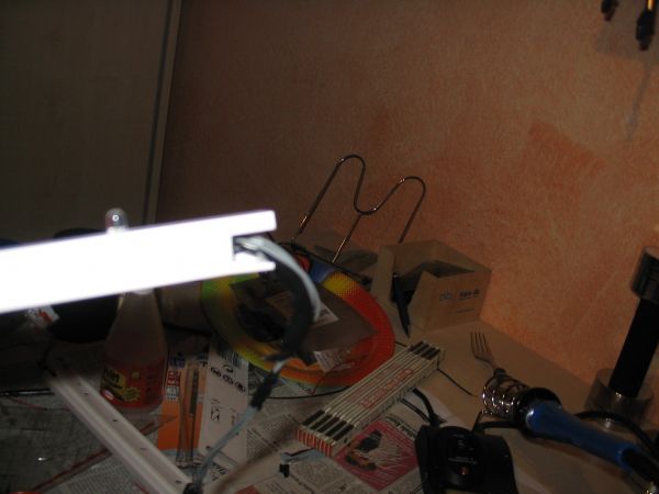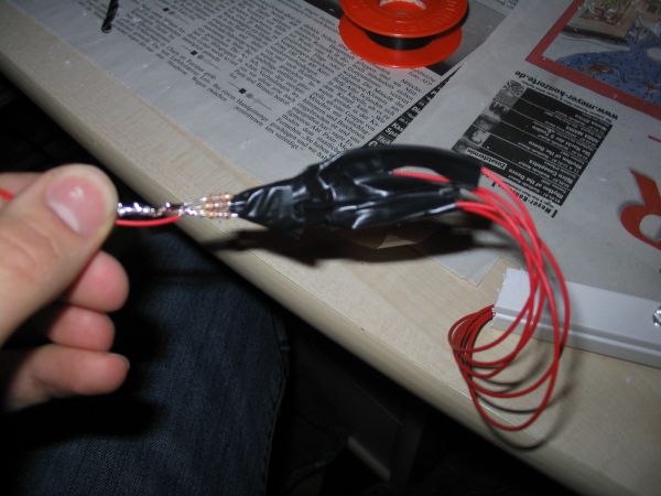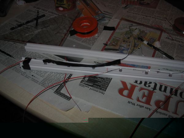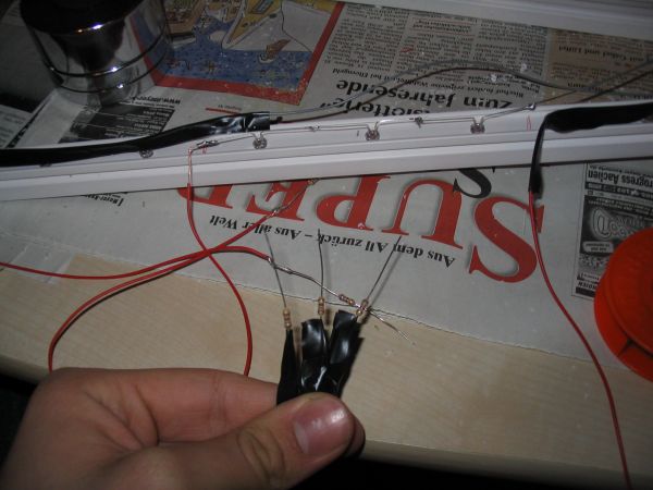 Widerstände an die + Kabel ran, und um kurzschlüsse zwischen den einzelnen LED Reihen zu vermeiden und um eine versehntliche paralellschaltung der Widerstände zu vermeiden, musste das ganze noch Isoliert werden