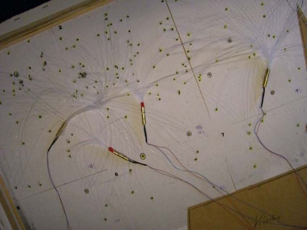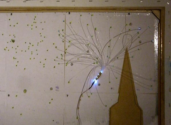 Da ich jetzt dieses Bild etwas interessanter gestalten wollte, habe ich mir überlegt, leuchtende Sterne in dem Himmel zu basteln. Einzelne LED's oder Lämpchen waren mir zu teuer und globig. Deswegen habe ich mich entschieden, Lichtwellenleiter (LWL) einzusetzen, wie sie auch in den "alten" UFO-Lampen eingesetzt werden. Also: LED beleuchtet LWL, die dann auf die Bildfläche geführt werden. Das paßt auch von den Dimensionen wunderbar, da der LWL einen Durchmesser von 0.5 mm hat.