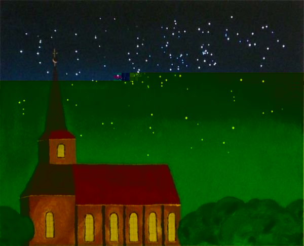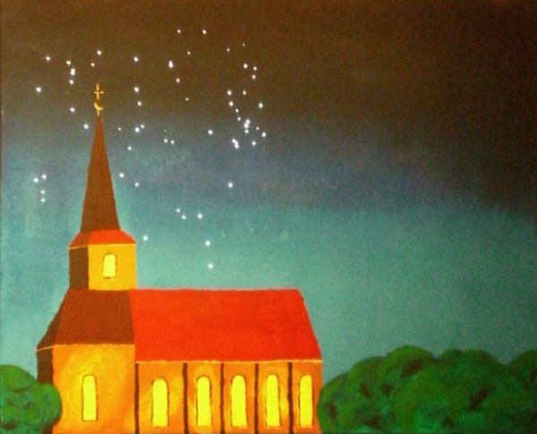 Ich habe ein Bild in Acryl gemalt, das eine Kirche am Abend mit einer Menge Himmel zeigt. Das Bild ist etwa 80x60 cm groß. Das nur nebenbei.