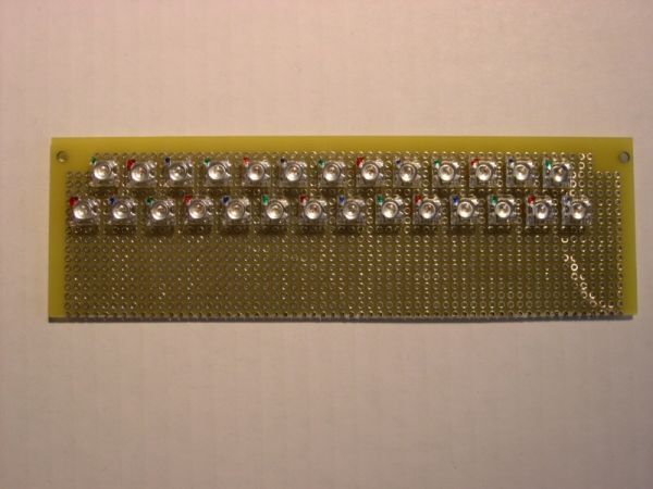 Hier habe ich die roten, grünen und blauen Superflux-LEDs verschachtelt auf eine halbe Europlatine mit Punktraster gelötet, jeweils 9 Stück pro Farbe: