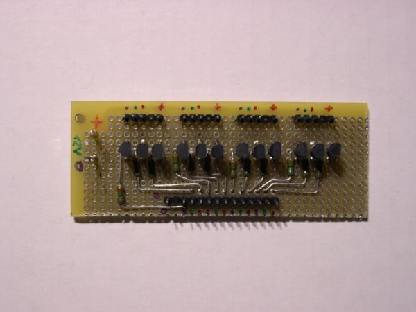 So, jetzt sind die LED-Cluster fertig, jetzt müssen sie noch zum leuchten gebracht werden. Dazu habe ich erstmal LED-Treiber aufgebaut, die aus nichts anderem bestehen, als jeweils einem NPN-Transistor und einem Basiswiderstand, der so gewählt ist, dass der Transistor ordentlich durchschaltet, wenn 5V von einem Mikrocontrollerausgang anliegen. Die Emitter sind alle zusammen auf Masse gelegt, deshalb haben die LED-Cluster eine gemeinsame Anode (Pluspol) und die Kathoden sind herausgeführt. Hier ist das Platinchen für die Treiberstufen: