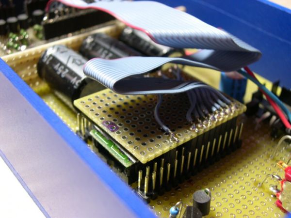 Links sieht man die LED-Treiber, die mit einem Flachbandkabel mit dem Mikrocontroller verbunden sind, in der Mitte liegend drei dicke Kondensatoren, um die Versorgungsspannung etwas zu puffern (wegen dem LED-Betrieb mit Pulsweitenmodulation) und rechts das Mikrocontrollergedöns.