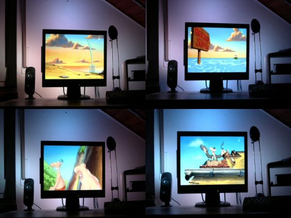 Die einzig praktikable Lösung mit Farb-Sensoren wäre für mich die Verwendung eines Mini-Color-LCD-Fernsehers (die bekommt man mittlerweile ja auch schon recht günstig), den man dann an einen Video-Ausgang des grossen TVs (oder parallel zum TV an einem Video-Ausgang des Zuspielgerätes) hängt, so dass man immer das gleiche Bild wie auf dem grossen TV drauf hat. Über dem Display des Mini-TVs kann man dann beliebig seine Sensörchen platzieren und alles in eine Blackbox stecken oder wo auch immer und schön versteckt irgendwo hinter dem TV anbringen.