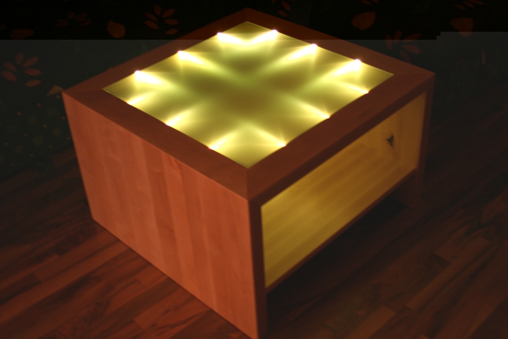 So, wieder einmal habe ich ein neues Projekt fertig gestellt. Es handelt sich hier um einen Wohnzimmertisch, dessen Glasoberfläche mit Hilfe von Leds ausgeleuchtet wird. Als Farbton wurde warmweiß gewählt.