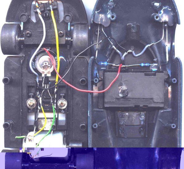 Links mein umgebauter Opel mit 30000 U/min Motor anderm Ritzel, 5mm Led´s 16000mcd und natürlich vielen Kampfspuren (Treppensturtz inkl.)
