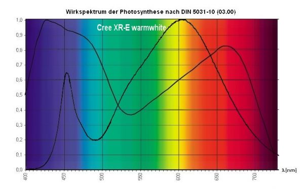 Das Problem bei Kaltweißen leds ist dass der zweite Peak im Spektrum genau dort liegt wo er nicht sein sollte und zwar im Photosyntheseminimum: