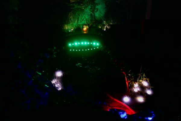 Hingegen sind die weißen Leds auf dem Teichboden angebracht und leuchten nach oben an die wasseroberfläche. Weitere weiße Leds wurden in Pflanzen versteckt um diese zu beleuchten.