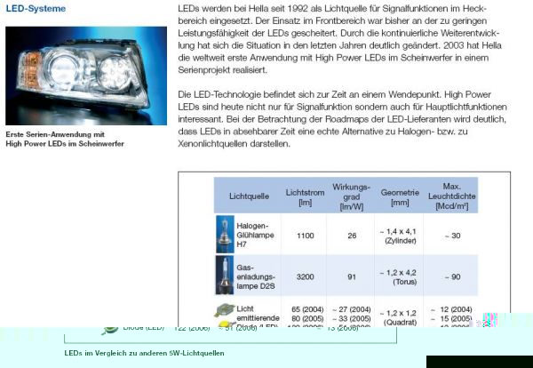 LEDs in der rückwärtigen KFZ-Beleuchtung sind ein alter Hut. Bereits 1991 (!) hatte der Cadillac Seville als erstes Serienauto eine 3. Bremsleuchte mit LEDs. (Da waren 3. Bremsleuchten hier noch strengstens verboten.).