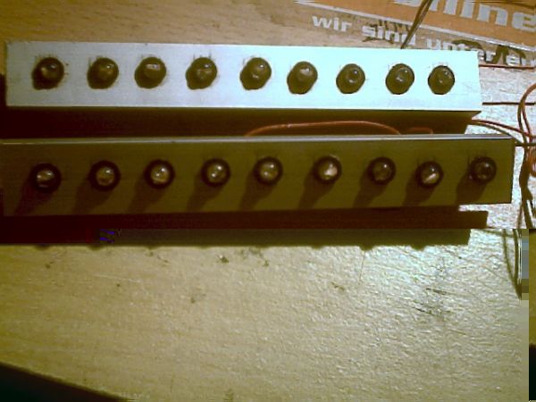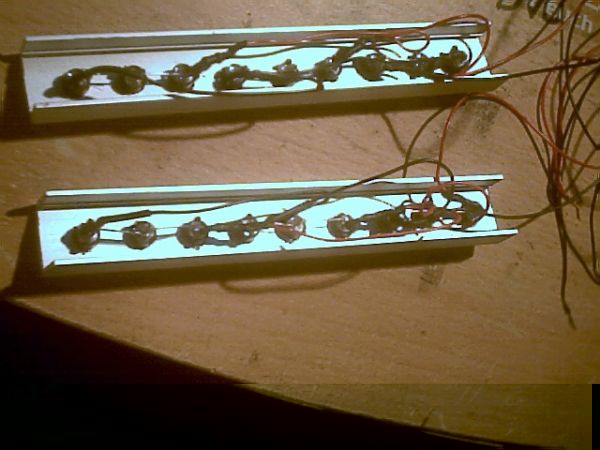 ALU-Leisten in U-Form gibt es auch bei Hela, ich bevorzuge für diese Arbeiten Vierkant-Rohre, diese werden auf der Vor- und auf der Rückseite gebohrt (bzw. durchgebohrt), die Schaltung außen aufgebaut und dann eingeschoben. Die LEDs kann man dann durch die rückseitige Bohrung vorsichtig in die dafür vorgesehen Löcher drücken. Damit es einfacher geht, benutze ich für diese Arbeiten keine Litze, sondern massiven Kupferdraht. Dann lässt sich die Schaltung leichter in das Vierkantrohr schieben, bis die LED´s vor dem vorgesehenen Loch sitzen.