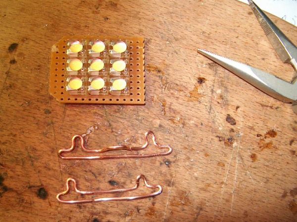 Nachdem die LED´s auf die Platine gelötet wurden, werden die Anschlussdrähte gebogen