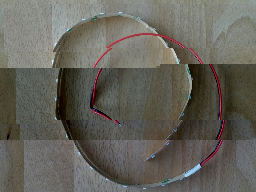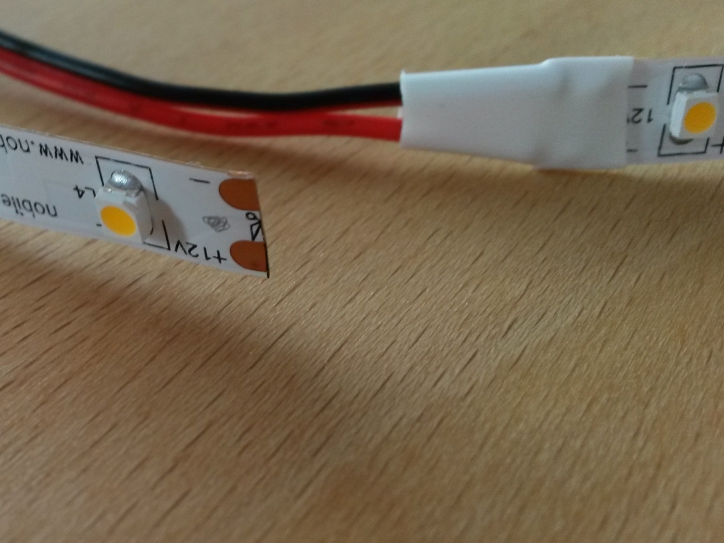 Das erste Foto zeigt das verbliebene Verschnitt-Stück des LED-Streifens. Wie man auf dem zweiten Foto im Detail sehen kann, ist das eine Ende bereits mit einem Anschlusskabel versehen, das andere Ende brav an der Schnittmarke abgetrennt.