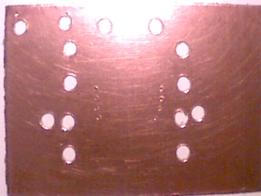freihändig gebohrte platine, leider hatte ich nur einen 1mm bohrer zur hand, das entgraten der bohrlöcher ist auch nicht so einfach, mit einer ständerbohrmaschiene wäre es auch sicher etwas genauer geworden.