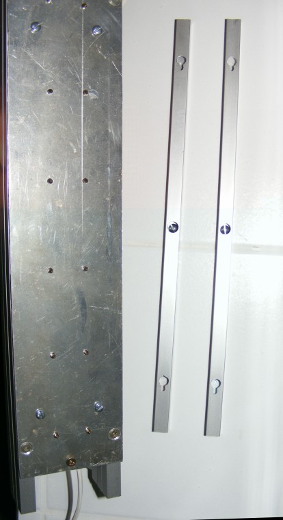 Aufhängung/Befestigung an der Wand (mit 4 flachen Blechschrauben, die nur 'halb' in das Alu-Blech geschraubt wurden, so dass man diese in die vorgesehenen Aussparungen an der Wand-Befestigung 'einhängen' kann):