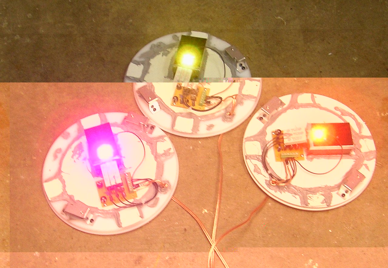 Auf dem Bild sind die fertigen Fader zu sehen sowie die P5 RGB Leds welche auf einem Kühlkörper montiert sind. An die LEDs werden nun die Widerstände gelötet sowie entsprechende Kabelstücke mit ca. 20cm