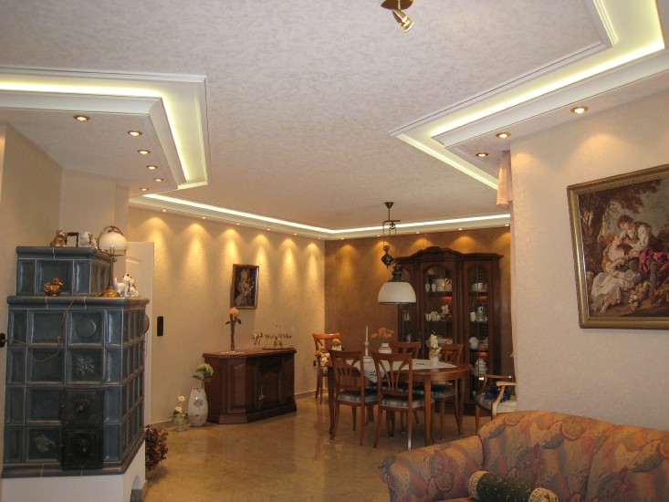ich habe in meinem Wohn-Esszimmer 34 Meter Superflux-Leisten verbaut. Die Stuckleisten lassen ober 3cm Platz für den Lichtschein an die Decke zu lenken. Eine zweite kleine Stuckleiste blockt das Licht sodass der Eindruck eines Lichtbandes entsteht.